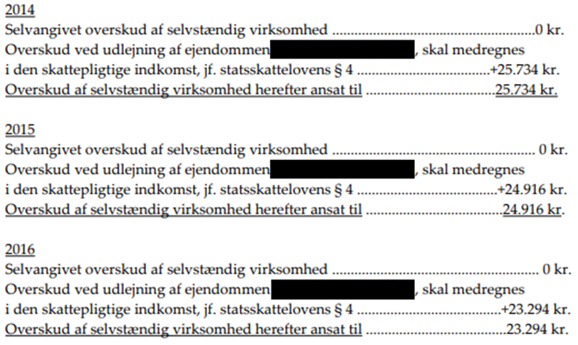 SKAT har ved skatteberegningen for indkomstårene 2014, 2015 og 2016 anset klageren for fuldt skattepligtig til Danmark efter kildeskattelovens § 1, stk. 1, nr. 1, og ansat overskud ved erhvervsmæssig udlejning af en helårsbolig til henholdsvis 25.734 kr., 24.916 kr. og 23.294 kr., som klageren er skattepligtig af efter statsskattelovens § 4, stk. 1, litra b.