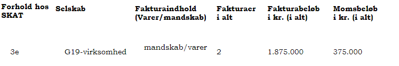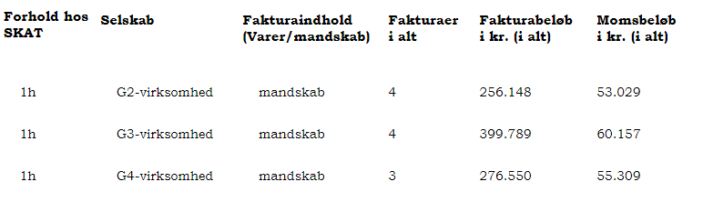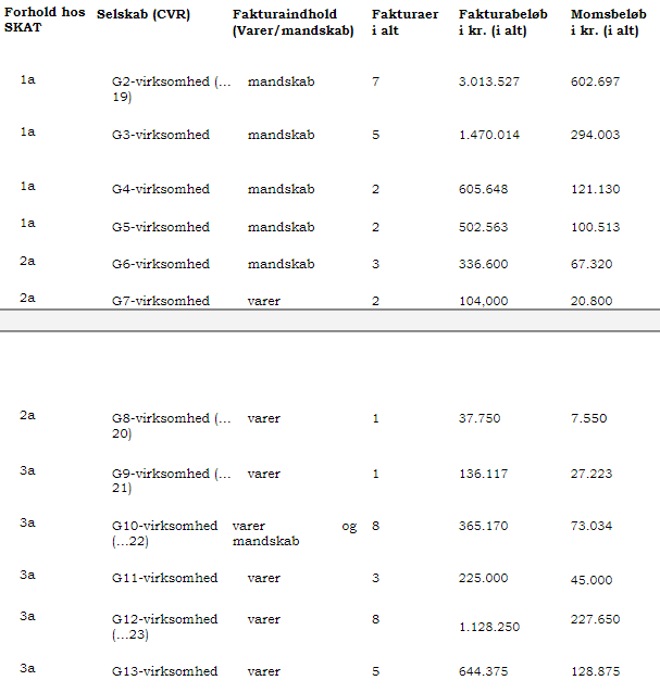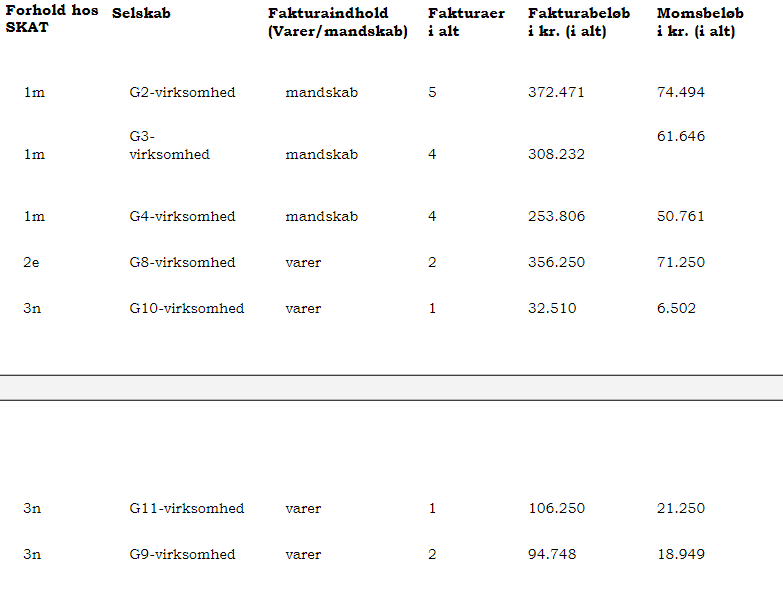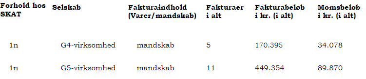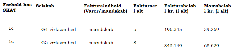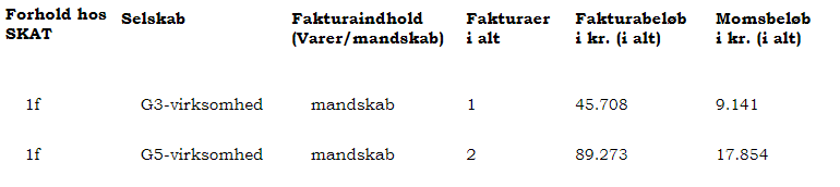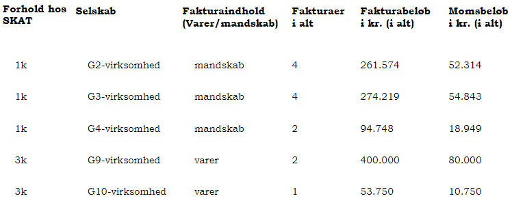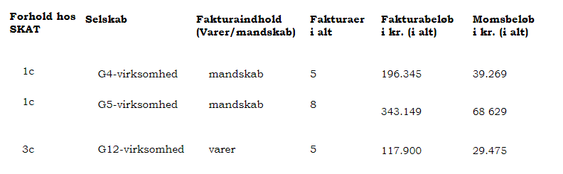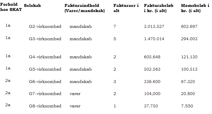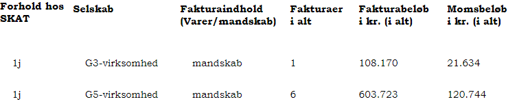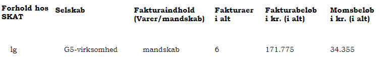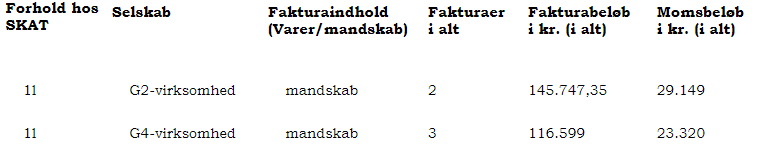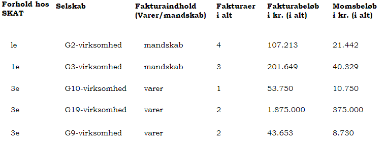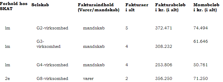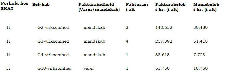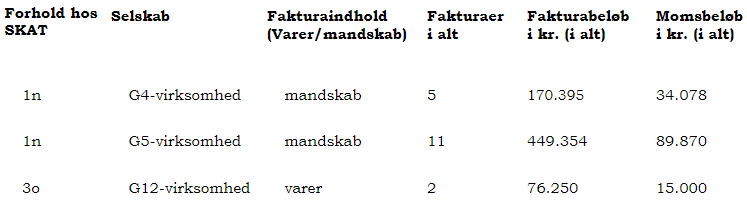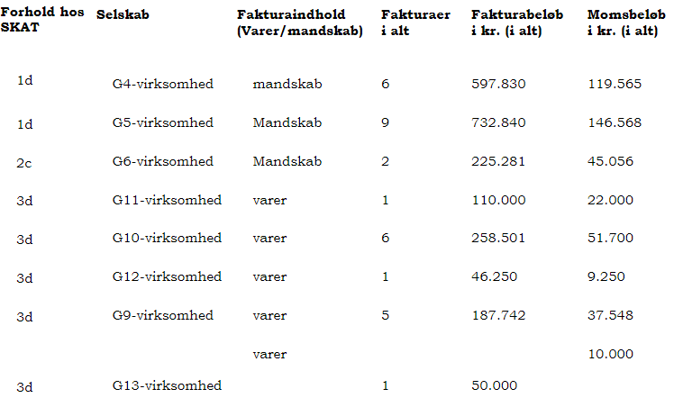 alle sammen med urigtigt indhold vedrørende levering af arbejdskraft og varer til selskabet G14-virksomhed, CVR ...24, tidligere G15-virksomhed, hvilke fakturaer var egnede til opgørelsen af G14-virksomhed afgiftstilsvar og hvilke fakturaer T1 og T6 i forening anvendte overfor SKAT til urigtigt at dokumentere en købsmoms på i alt 94.077kr.