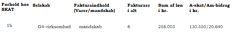 alle sammen med urigtigt indhold vedrørende levering af arbejdskraft til selskabet G14-virksomhed, CVR ...24, tidligere G15-virksomhed, på i alt 258.003 kr. (ekskl. moms), hvilke fakturaer T1 og T6 i forening anvendte som dokumentation overfor SKAT, således at selskabet G14-virksomhed kunne undlade at opfylde pligten til at indeholde A-skat og AM-bidrag med i alt 130.550 kr. i A-skat og 20.640 kr. i AM-bidrag.