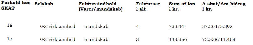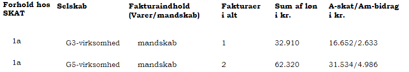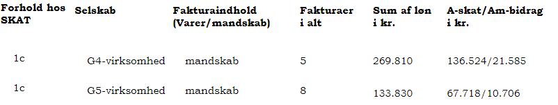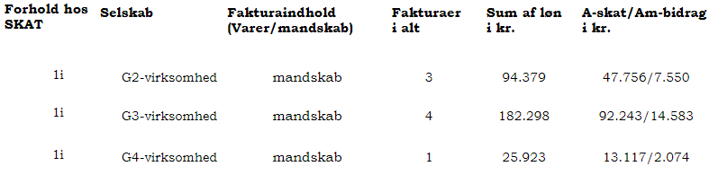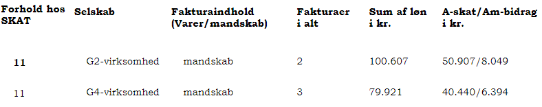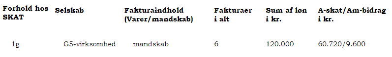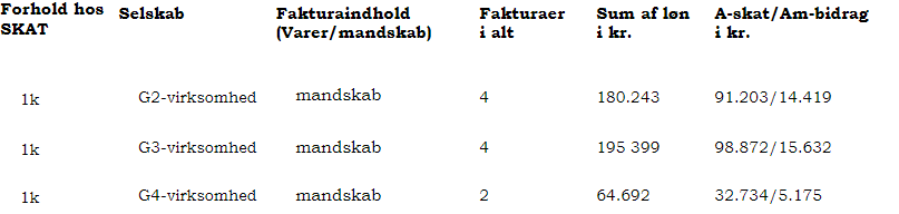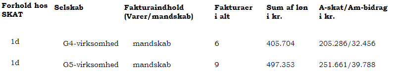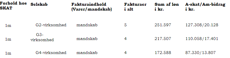 alle sammen med urigtigt indhold vedrørende levering af arbejdskraft til selskabet G1-virksomhed, CVR ...18, på i alt 3.893.931 kr. (ekskl. moms), hvilke fakturaer T1, T3 og T6 i forening, anvendte som dokumentation overfor SKAT. således at G1-virksomhed kunne undlade at opfylde pligten til at indeholde A-skat og AM-bidrag med i alt 1.970.329 kr. i A-skat og 311.514 kr. i AM-bidrag.