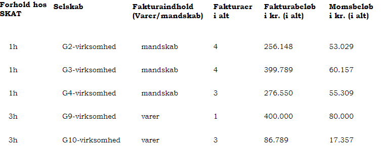 alle sammen med urigtigt indhold vedrørende levering af arbejdskraft og varer til selskabet G1-virksomhed, CVR ...18, hvilke fakturaer var egnede til opgørelsen af G1-virksomhed afgiftstilsvar og hvilke fakturaer T1, T3 og T6 i forening anvendte overfor SKAT til urigtigt at dokumentere en købsmoms på 1.214.013 kr.
