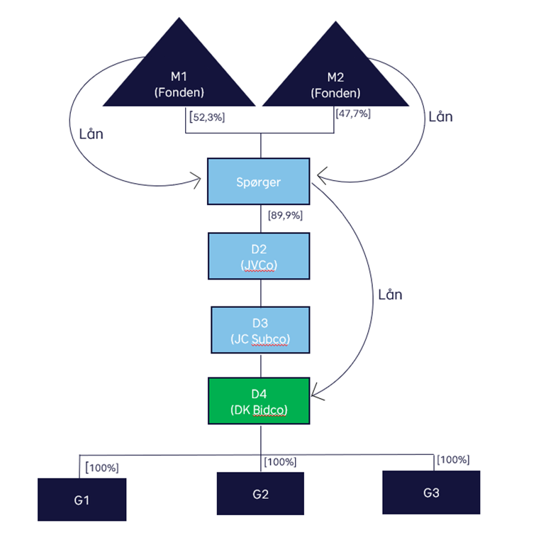 Spørger er indirekte ejer af DK BidCo via to selskaber i Luxembourg (JVCo og JV SubCo). Spørger ejer således XX,X % af JVCo, mens en minoritetsaktionær ejer resten. JVCo ejer JV SubCo med 100 %, som igen ejer DK BidCo 100 %.