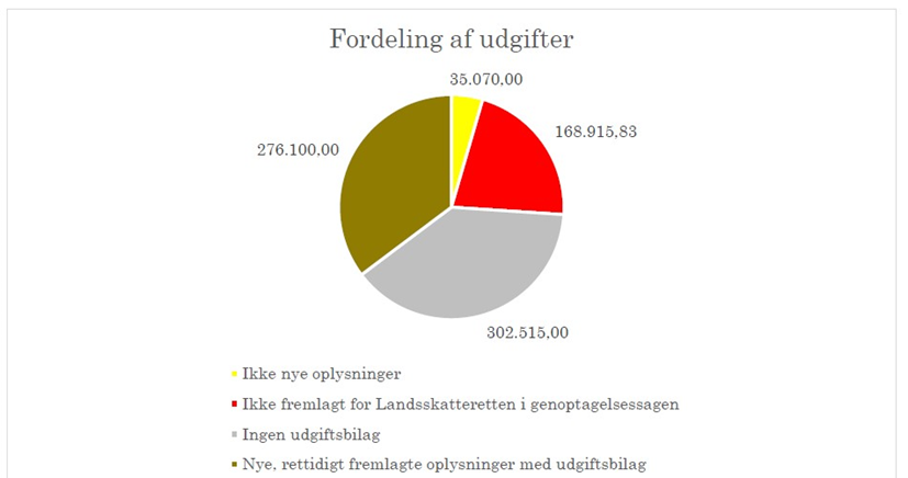 Da der ikke foreligger udgiftsbilag for de påberåbte udgifter, lever A ikke op til kravet om et sikkert bevis, bestyrket af objektive kendsgerninger, og oplysningerne kunne således ikke have ført til et ændret resultat, hvis de havde foreligget tidligere.