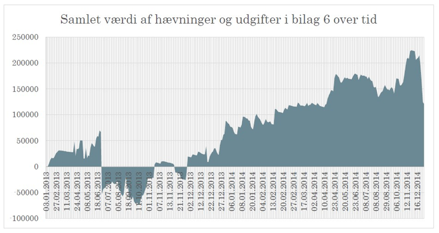 Det gør sig herudover gældende, at der ikke er tids- og beløbsmæssig sammenhæng mellem de beskattede hævninger og de påberåbte udgifter i bilag 6 benævnt indskud. En sammentælling af hævninger og indskud i bilag 6 viser følgende udvikling i summen: