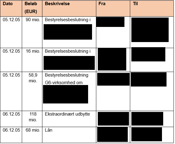Det fremgår af det af bestyrelsen i det Y3-land moderselskab, (red.fjernet.koncern), den 15. december 2005 underskrevne bestyrelsesprotokollat, at bestyrelsen på denne dato besluttede at hjemtage et ekstraordinært udbytte fra G5-virksomhed på Y2-land med henblik på anvendelse heraf i overensstemmelse med en plan, "(red.fjernet.overskrift)", som var underskrevet af selskabets bestyrelsesformand den 12. december 2005. Ved et samme dag underskrevet bestyrelsesprotokollat, "Directors resolution effective as of 15 December 2005", vedtog bestyrelsen i G5-virksomhed at udbetale et udbytte på 140 mio. EUR til (red.fjernet.koncern). Det herefter af G5-virksomhed til (red.fjernet.koncern) udbetalte udbytte på 140 mio. EUR var for så vidt angår et beløb på 58,873 mio. EUR ubestridt finansieret af den rentebetaling på 58,873 mio. EUR, som H1 havde foretaget den 13. december 2005, og som G5-virksomhed den 14. december 2005 havde modtaget via de Y1-lande gennemstrømningsselskaber. Det er ligeledes ubestridt, at det udbetalte udbytte, herunder den andel, som hidrørte fra renterne på 58,873 mio. EUR, herefter blev beskattet i Y3-land med den særligt lave skattesats, som fulgte af den Y3-land "(red.fjernet.fremmedlov)" fra 2004.