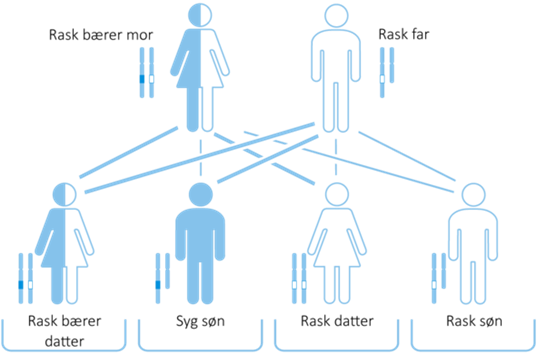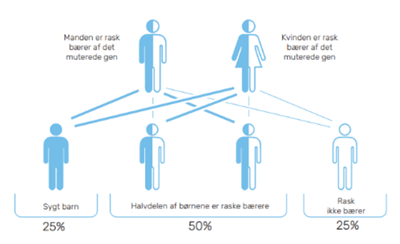 To kopier af det samme, muterede gen, et hos kvinden og et hos manden, forårsager sygdommen, hvilket kan illustreres på følgende måde: