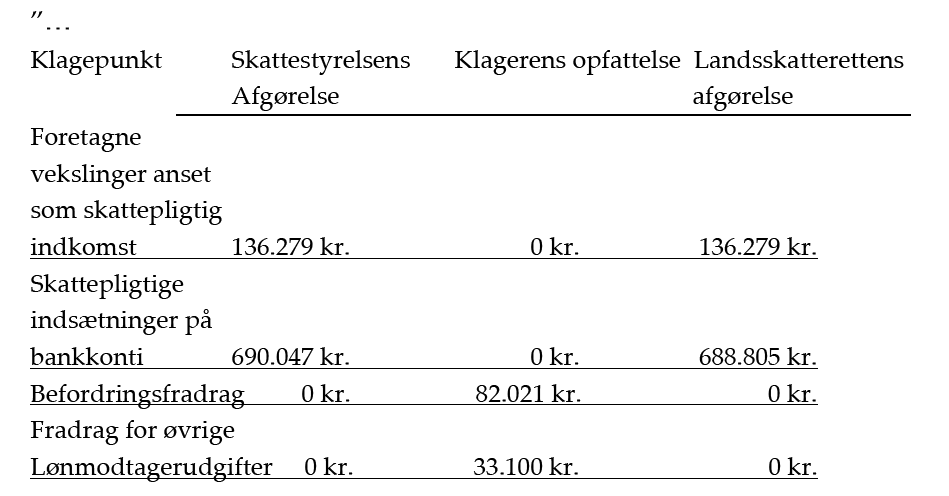 For så vidt angik de foretagne valutavekslinger med et beløb på i alt 136.279,70 kr. lagde retten til grund, at der ved vekslingerne var taget kopi af skatteyderens kørekort og sygesikringsbevis, ligesom der også ved en af vekslingerne var taget kopi af skatteyderens pas og i et andet tilfælde var underskrevet med skatteyderens navn på vekselbilaget. Skatteyder gjorde gældende, at han havde været udsat for identitetstyveri. Trods skatteyder tidligere var opfordret af skattemyndighederne til at anmelde forholdet til politiet eller på anden måde godtgøre identitetstyveriet, var det først under sagens behandling ved retten, at skatteyder anmeldte forholdet til politiet. Skatteyder dokumenterede ikke, at han havde fulgt op på anmeldelsen til politiet ved at indlevere den dokumentation, som politiet anmodede om. Retten lagde herefter til grund, at det var skatteyder, der foretog vekslingerne og således haft rådighed over beløbet på 136.279,870 kr. Det var ikke godtgjort, at beløbet var skatteyders skattepligtige indkomst uvedkommende.