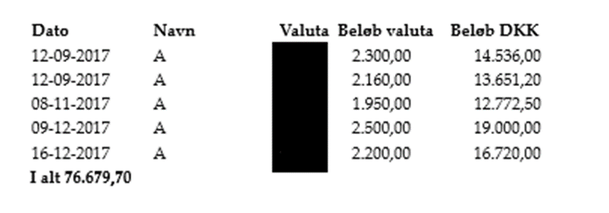 A har købt og solgt (red.valuta.nr.1.fjernet) samt (red.valuta.nr.2.fjernet) hos (red.valuta.nr.1.fjernet) (red.udveksling.nr.1.fjernet) i 2017 for et beløb på i alt 136.279 kr. Vekslingerne er foretaget med kontante betalinger, jf. bilag A-F. Dertil kommer, at A samme år har modtaget indsætninger, som er anset som skattepligtig indkomst, på sin bankkonto på 688.805 kr. (bilag G).