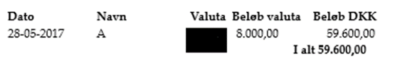 3.1 Vekslingerne foretaget hos (red.valuta.nr.1.fjernet) (red.udveksling.nr.1.fjernet) i 2017. A er skattepligtig af de beløb, der er foretaget vekslinger med hos (red.valuta.nr.1.fjernet) (red.udveksling.nr.1.fjernet) i 2017.