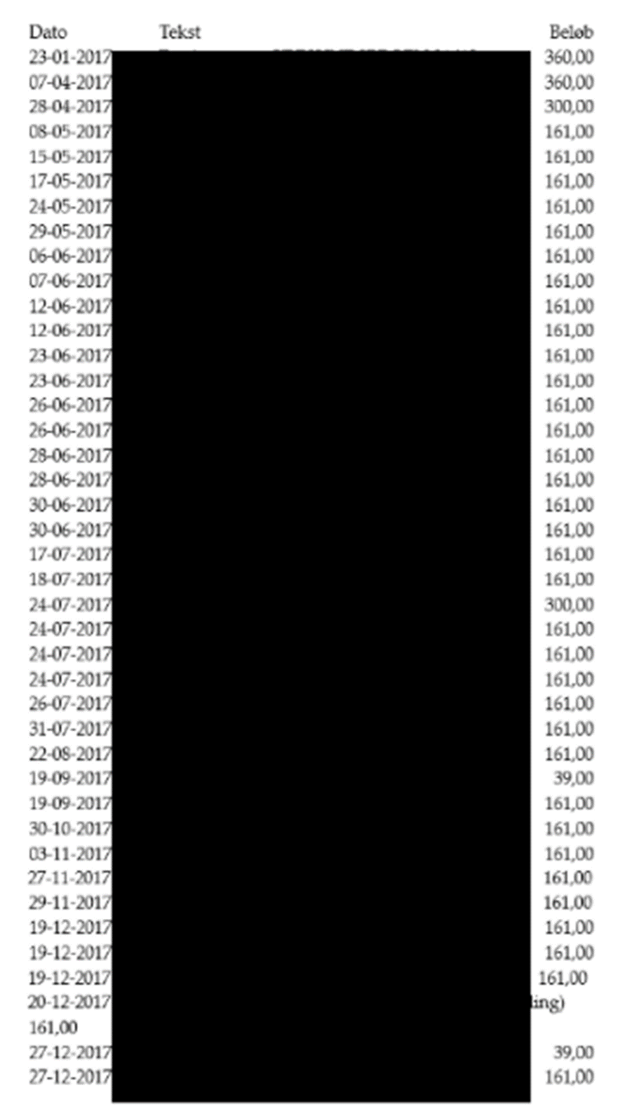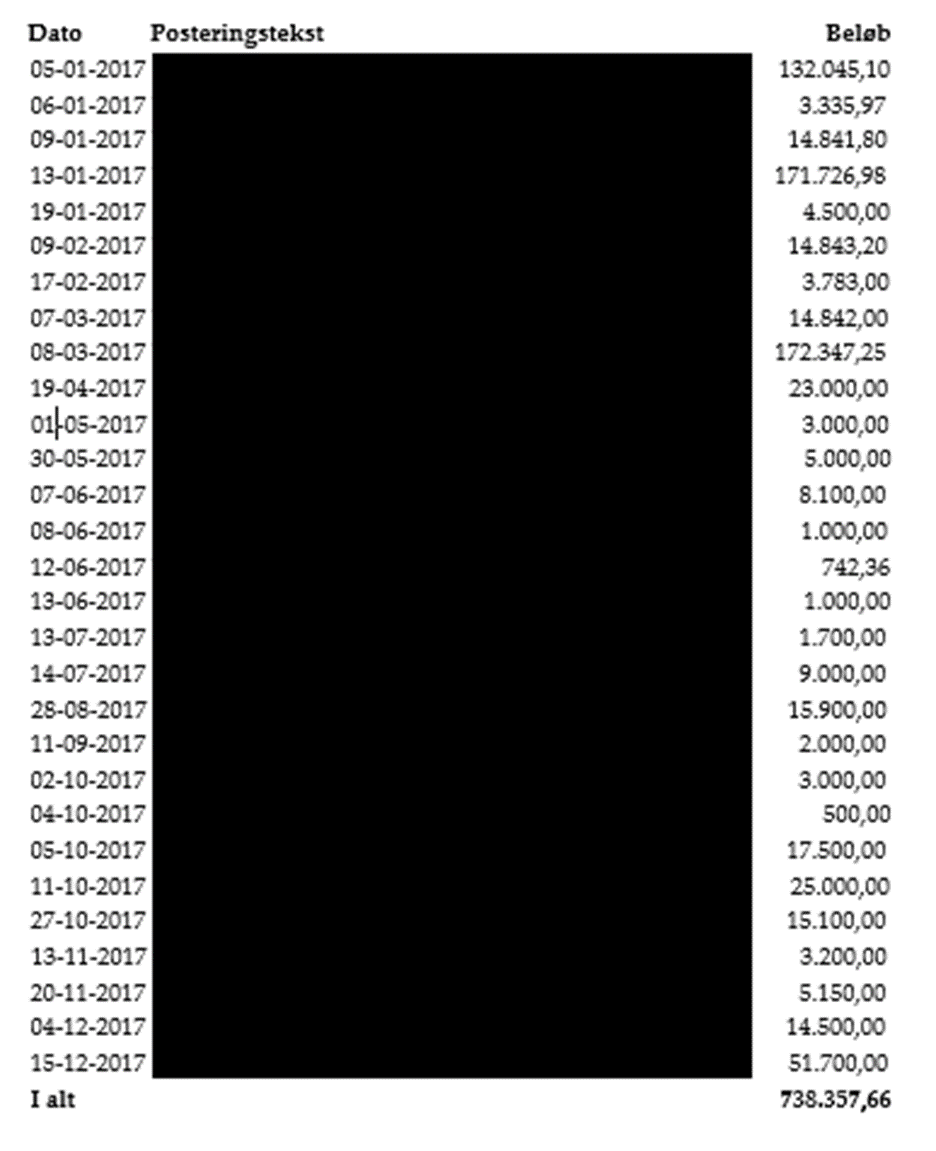 Den 15. december 2017 modtog A 51.700 kr. på sin konto med posteringsteksten (red.tekst.nr.8.fjernet). Retten lægger til grund, at beløbet samme dag blev videreoverført til en anden konto tilhørende A. A har ikke kunnet forklare præcist, hvad overførslen angik.