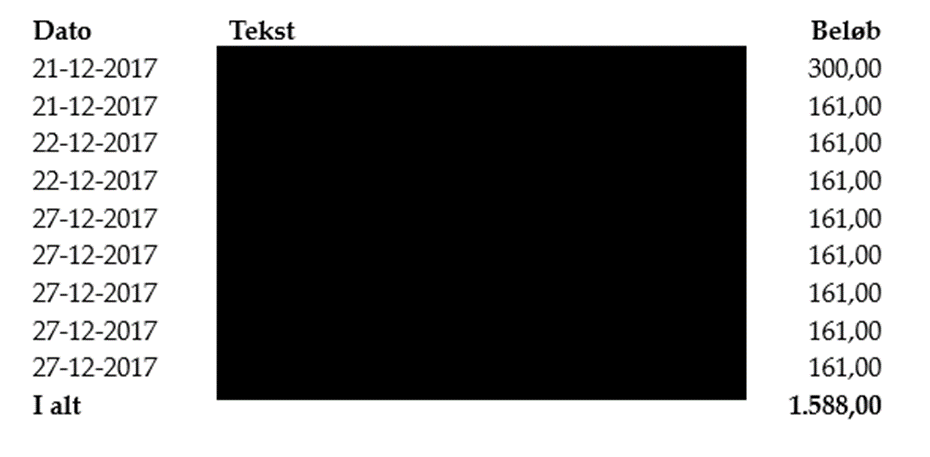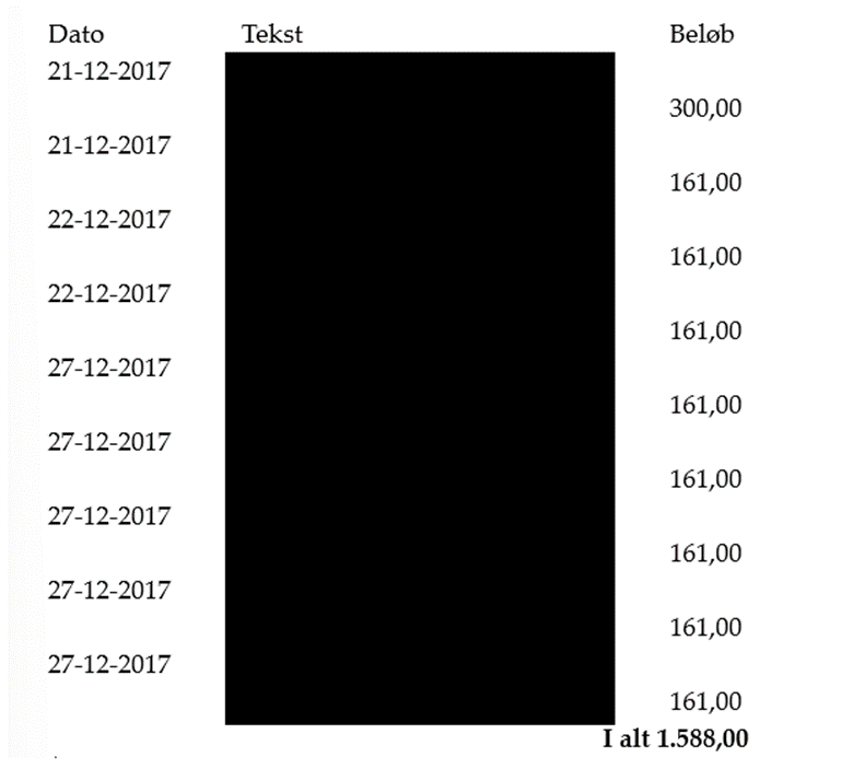 Henholdsvis den 9. og den 16. december 2017 købte en kunde henholdsvis 2.500 og 2.200 (red.valuta.nr.1.fjernet) hos (red.valuta.nr.1.fjernet) (red.udveksling.nr.1.fjernet), der ved begge køb tog kopi af A's kørekort og det nævnte sygesikringsbevis.
