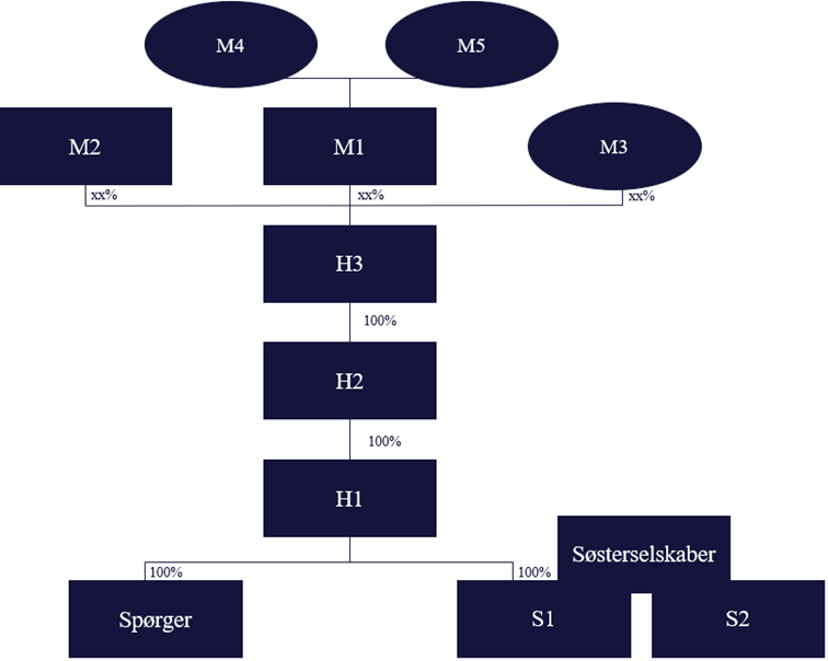 Spørger er administrationsselskabet i sambeskatningsgruppen, der udover Spørger består af de to danske søsterselskaber S1 og S2. Siden 20xx har søsterselskaberne været 100 pct. ejet af H1. Tidligere var S1 og S2 100 pct. ejet af Spørger.