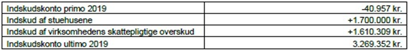 Skattestyrelsen bortså i den forbindelse fra korrektionen i 2016, således at det blev lagt til grund, at indskudskontoen udgjorde -1.904.397 primo indkomståret 2019 samt -294.088 ultimo indkomståret 2019 og primo indkomståret 2020. Som følge heraf foretog Skattestyrelsen konsekvensrettelser i A's overskudsdisponering m.v. for indkomstårene 2019 og 2020.