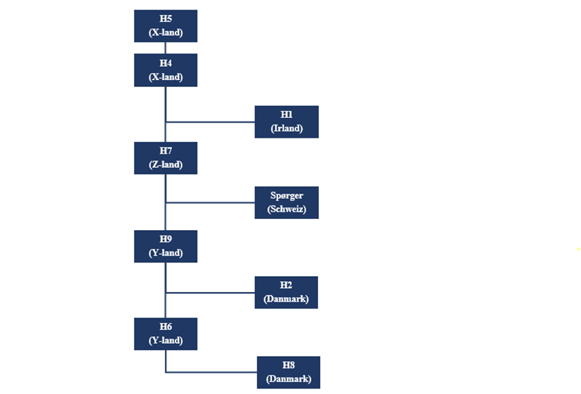 H5 er hjemmehørende og børsnoteret i X-land. Vedlagt denne anmodning om bindende svar er en simplificeret koncernstruktur, der viser ejerskabet i henholdsvist Spørger og H1 hjemmehørende i Irland.