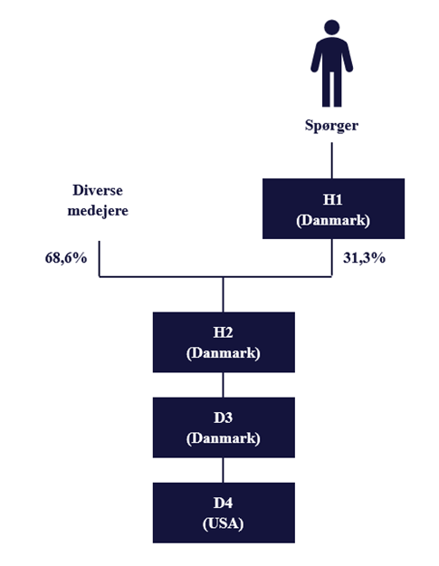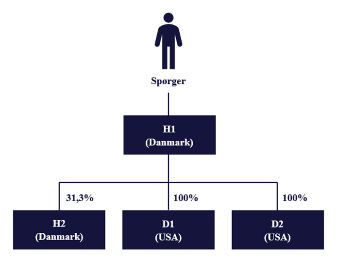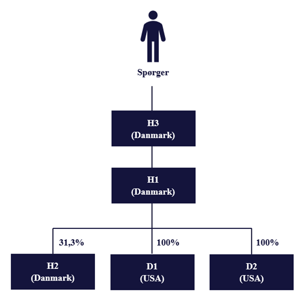 Pr. 31-12-2023 ejede Spørger 100 % af aktiekapitalen i selskabet H1 som pr. 31-12-2023 ejede 31,3 % af H2 og 100 % af to amerikanske selskaber, henholdsvis D1 og D2. I forbindelse med etableringen af D1 og D2 i oktober 2023 erhvervede H1 samtidig 100 % af kapitalandelene i selskaberne.