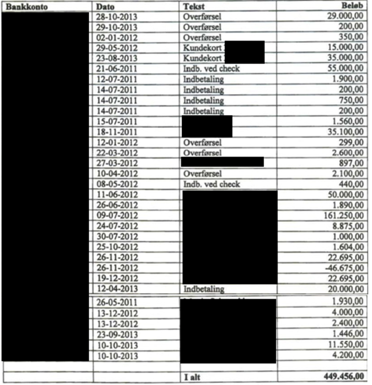 SKAT udarbejdede på baggrund af de fremsendte kontoudtog vedrørende i alt 14 konti opgørelser over kontobevægelserne.