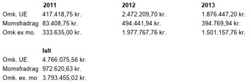 A fremsendte endvidere den 12. oktober 2014 oversigt over udstedte fakturaer for 2011-2013 vedrørende G1-virksomhed, det fremgår heraf, at der blev faktureret inkl. moms.
