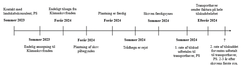 2. rate af tilskuddet udbetales inden for en periode på 2-3 år efter at skoven er færdigsynet. Dette fremgår som et led i tilskudsbetingelserne.