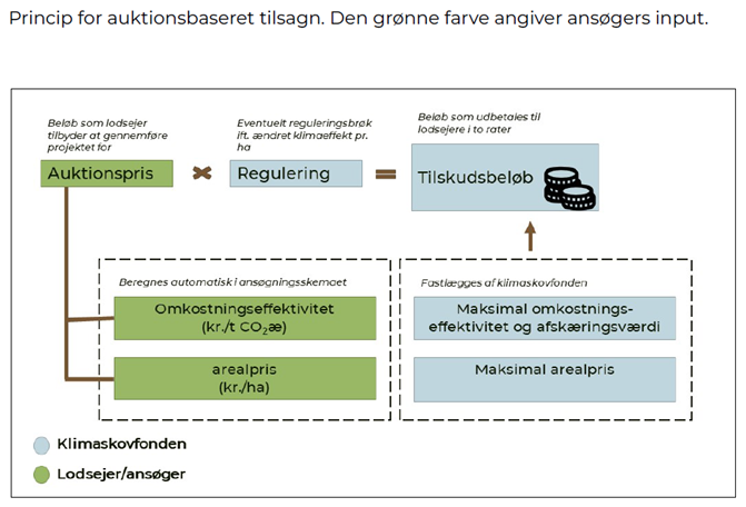 Klimaskovfondens tilskudsordning baserer sig ifølge fonden på flat rate-udbetalinger, som skal sikre, at tilskuddene ydes på markedsvilkår og gives til de projekter med den bedste omkostningseffektivitet. Lodsejeren angiver i forbindelse med sin ansøgning en auktionspris og et estimat for den CO2-binding, der forventes på arealet på lang sigt. Dette omregnes til en omkostningseffektivitet givet ved kr. pr. tons CO2. Omkostningseffektiviteten er afgørende for, hvordan projekterne prioriteres med henblik på at udvælge de projekter, som skal modtage tilskud.