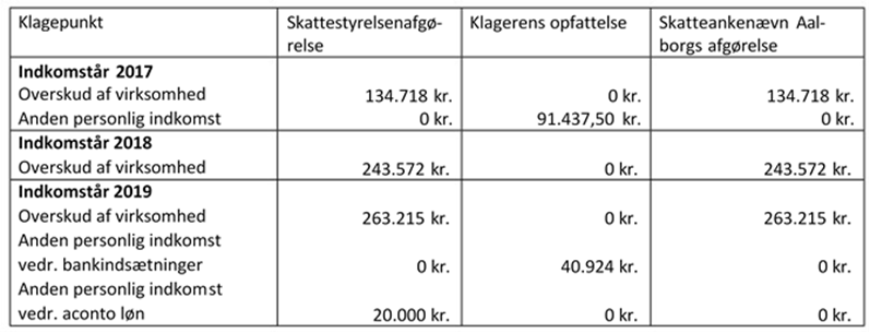 Skattestyrelsen fastsatte A's overskud af virksomhed på baggrund af indsætningerne på hans konto. Skatteankenævn Aalborg har tiltrådt dette skøn. Nævnet lagde herved også vægt på, at der ikke var fremlagt dokumentation for afholdte udgifter, der kunne henføres som driftsomkostninger i virksomheden, hvorfor der ikke kunne godkendes fradrag for dette.