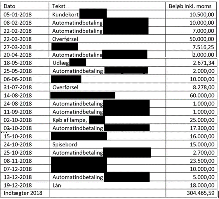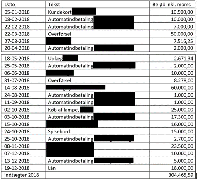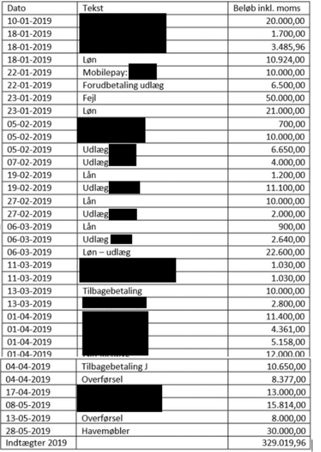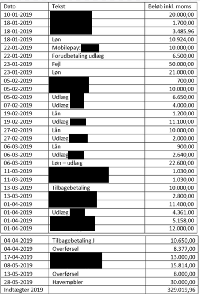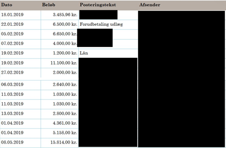I øvrigt er det påfaldende, at fire ud af de ti indsætninger, der indsættes over en periode på fire måneder, kommer fra den samme person, som derudover indsatte 18.000 kr. den 19. december 2018 med posteringsteksten "lån".
