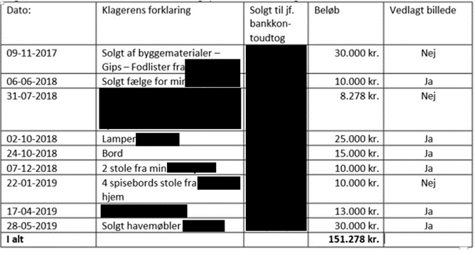 Klageren forklarer blandt andet at der er solgt privat indbo for følgende: