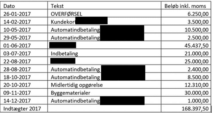 På klagerens bankkontoudtog har Skattestyrelsen fundet følgende indsætninger i indkomstårene 2017, 2018 og 2019.