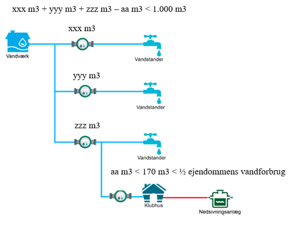 "Spildevandsudledere, der ikke opkræver årlige driftsbidrag efter tilknyttede ejendommes vandforbrug, kan fastsætte vandforbruget til 170 m³ pr. ejendom, dog mindst 170 m³ pr. helårsboligenhed og mindst 70 m³ pr. boligenhed, der ikke er hel-årsbolig. Det er en forudsætning, at mindre end halvdelen af den enkelte ejendoms vandforbrug udledes som afgiftspligtigt spildevand og ikke overstiger 1.000 m³."