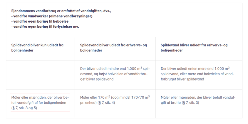 "Vandforbruget opgøres efter måler eller som et skønnet forbrug, der dog mindst skal svare til den mængde vand, hvoraf der betales afgift efter lov om afgift af ledningsført vand. For ejendomme, der forbruger vand, der ikke er omfattet af lov om afgift af ledningsført vand, opgøres forbruget efter målere, såfremt forbruget overstiger 1.000 m³ årligt. For vandforbrug under 1.000 m³ årligt, som ikke er omfattet af lov om afgift af ledningsført vand, kan vandforbruget opgøres efter måler eller fastsættes til mindst 170 m³ årligt pr. ejendom, dog mindst 170 m³ pr. helårsboligenhed og mindst 70 m³ pr. boligenhed, der ikke er helårsbolig. For erhvervsejendomme kan der foretages fradrag for vand, der medgår i produktionen eller af anden grund ikke afledes til det pågældende spildevandsanlæg. Fradraget kan foretages i samme omfang, som der ikke opkræves bidrag til driften af spildevandsanlægget af den pågældende mængde. Ejere af erhvervsejendomme, der betaler afgift efter § 2, stk. 2, kan kun foretage fradrag for den del, der overstiger 1.000 m³."